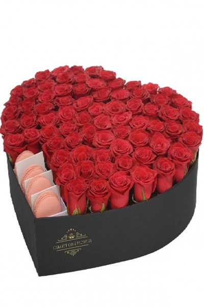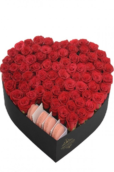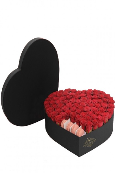 Kalp şeklinde kutu, içerisinde kırmızı güller ile süslenmiş ve makaron ürünleri bulunan kutu ürün.