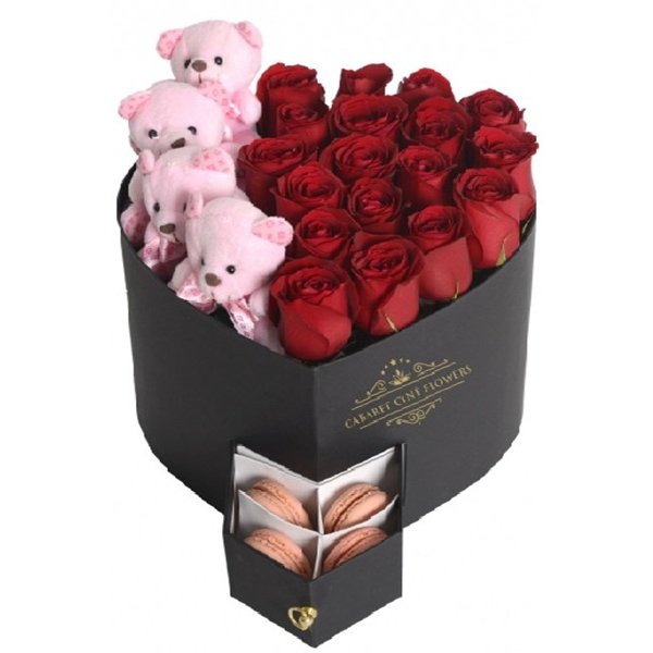 Kalp şeklinde kutu, içerisinde kırmızı güller ile süslenmiş küçük pembe renkli ayıcıklar ve çekmecesinde makaron ürünleri bulunan kutu ürün.