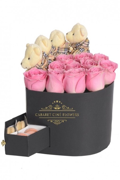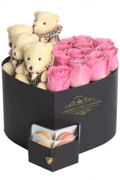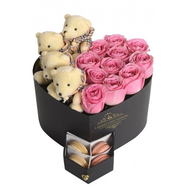 Kalp şeklinde kutu, içerisinde pembe güller ile süslenmiş küçük pembe renkli ayıcıklar ve çekmecesinde iki renkli makaron ürünleri bulunan kutu ürün.