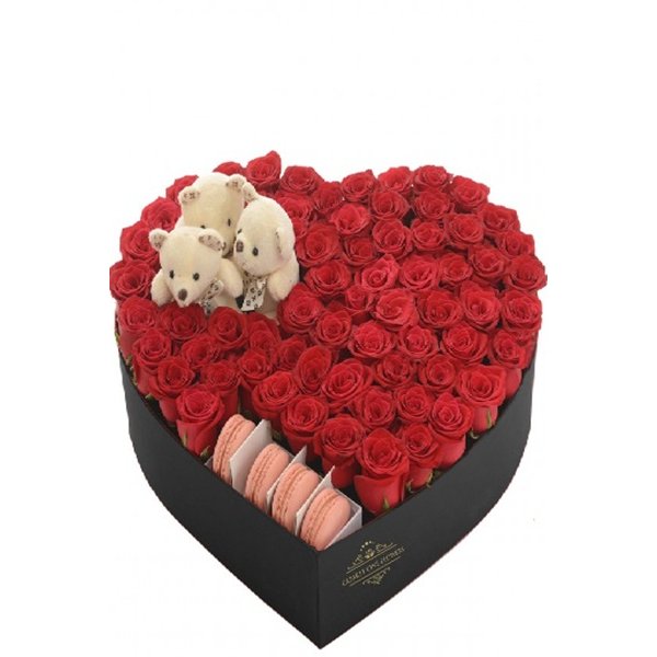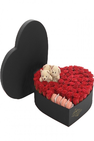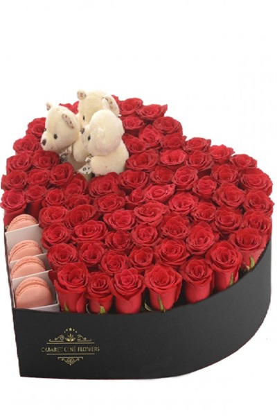 Kalp şeklinde kutu, içerisinde kırmızı güller ile süslenmiş ve makaron ürünleri bulunan kutu ürün.