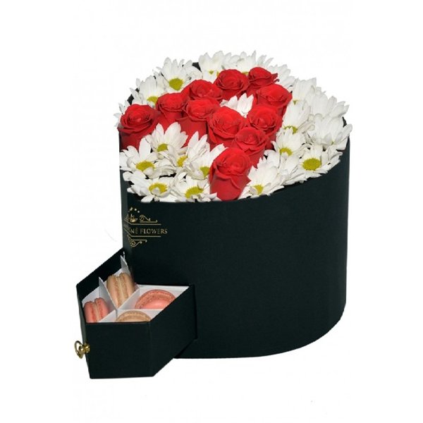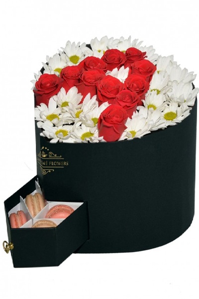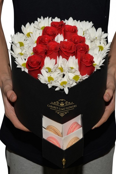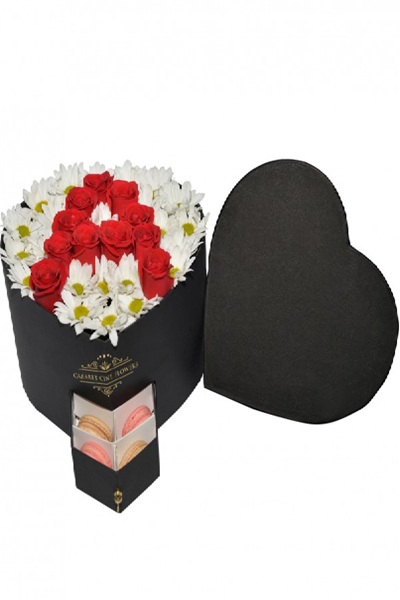 Kalp şeklinde kutu, içerisinde kırmızı güller ile sevdiğinin baş harfini yazabilirsiniz. Zeminde beyaz renkli papatyalar ile Süslenmiş Kutu Ürün. Ayrıca Makaron Ürün.