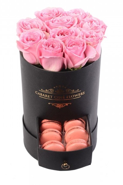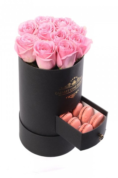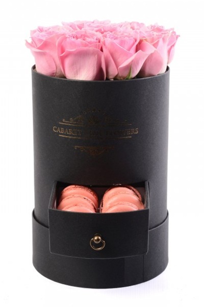 Silindir kutu, içerisinde pembe güller ile süslenmiş ve çekmecesinde makaron ürünleri bulunan kutu ürün.